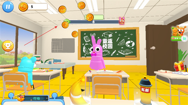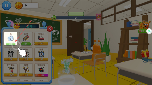 2、进入关卡后打开行动界面,选择纸团、铅笔等整蛊道具,点击道具即可对目标触发整蛊操作,借助道具推进整蛊流程。