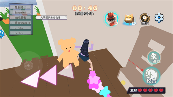 1、进入关卡前会显示准备倒计时,此阶段可通过左下方轮盘控制角色移动,提前熟悉当前场景的布局,为后续躲藏或抓捕做铺垫。