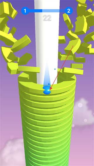 1、控制蓝色小球下落,击碎黄色堆栈层,积累得分。