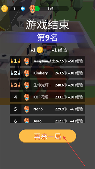 4、游戏结束后显示排名,点击再来一局重新挑战。
