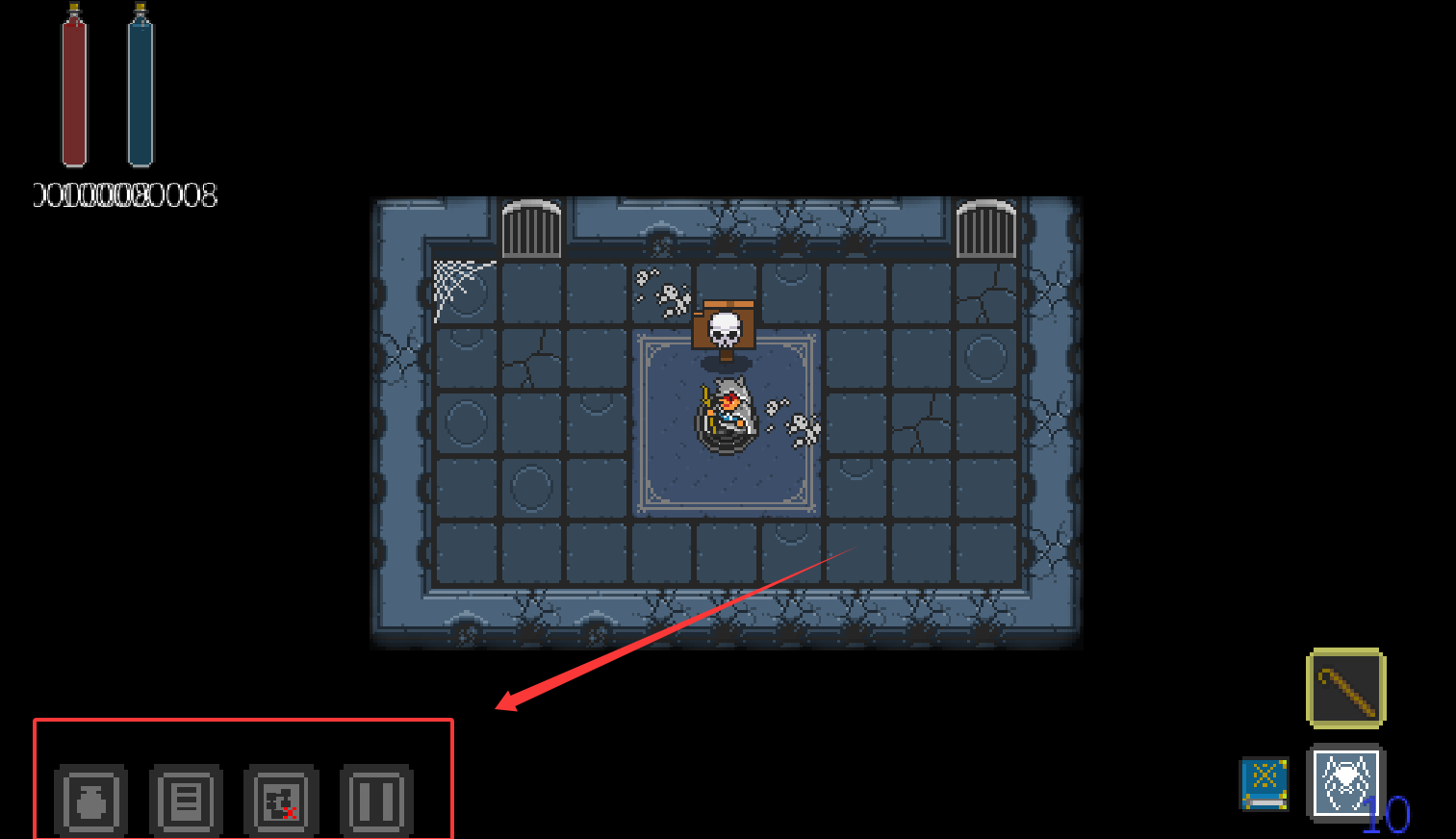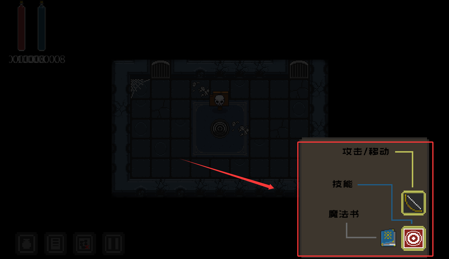 2、遭遇敌人时,直接点击目标即可发动攻击,移动则需点击地面方块。界面左下角的瓶子图标负责打开背包。