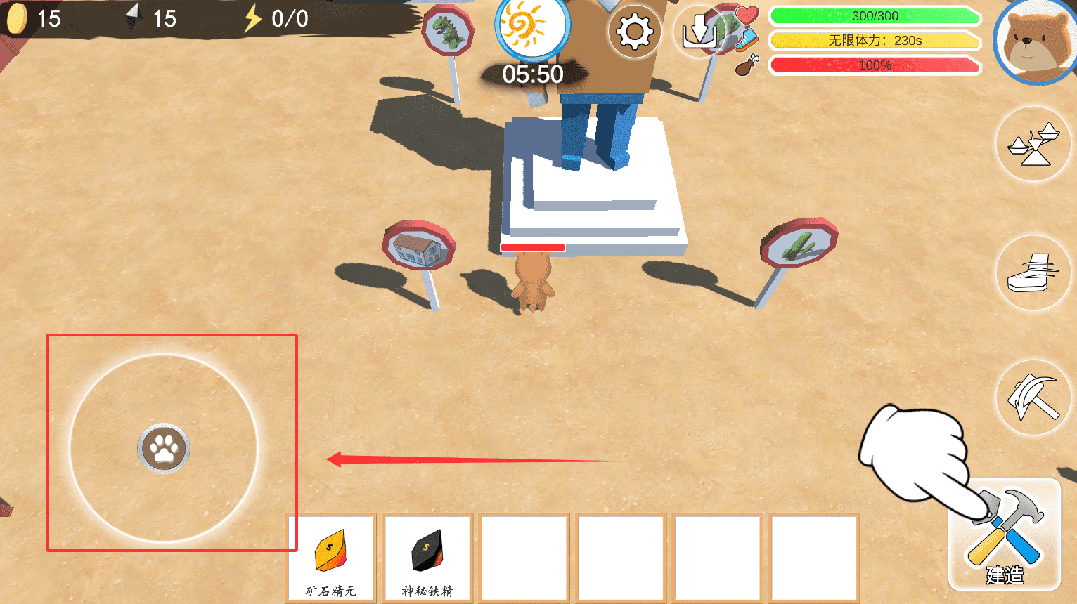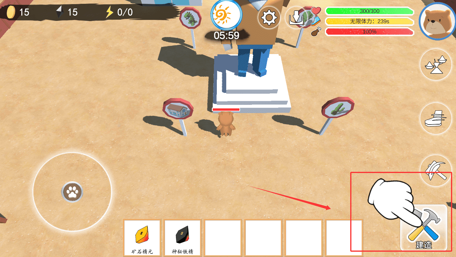 4、初期需合理选择建筑位置,搭建帐篷与金矿等设施提升资源产出与生存能力,完成建造后可点击手掌图标进行升级出售或开采。