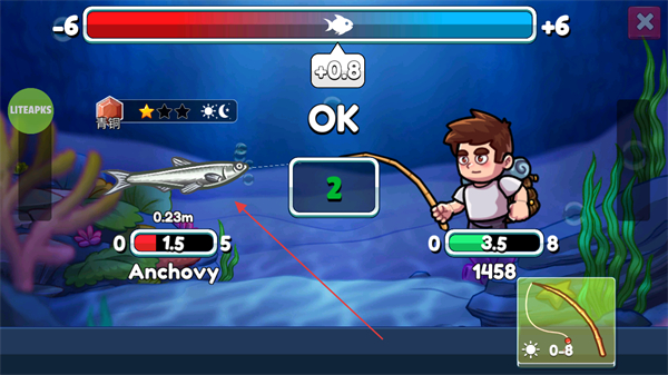 2、观察鱼的拉力数值,点击数字按钮调整钓竿力度,匹配鱼的拉力节奏。