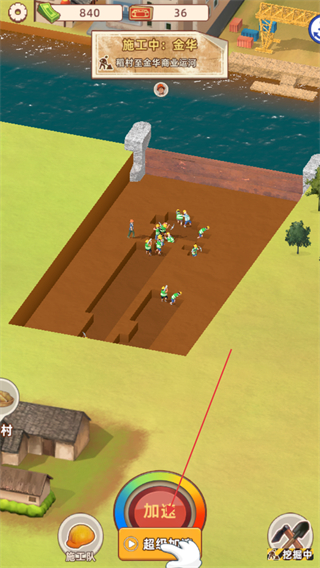 2、点击超级按钮强化加速效果,增加施工工人数量,提升挖掘效率。