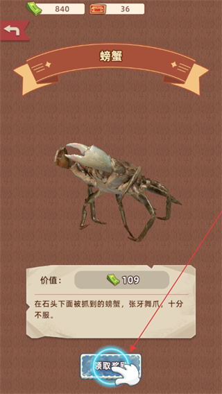 4、挖掘获得螃蟹道具,查看其价值,点击领取获取该道具及对应资源。