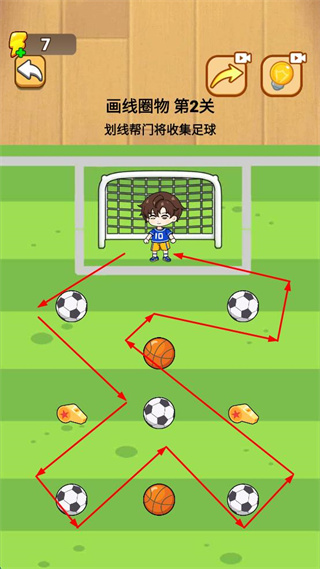 3、在画线圈物中,划线连接所有足球并避开篮球等物品,帮助门将完成收集。