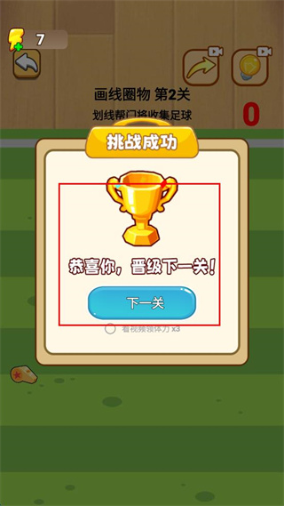 4、挑战成功后,点击弹出界面里的蓝色“下一关”按钮,进入后续的游戏关卡。