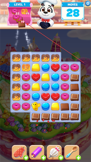 突破传统三消单一消除效果,根据曲奇匹配数量和形状,分别解锁特殊曲奇、彩虹蛋糕、三明治蛋糕三种特殊道具,每种道具都有独特的大范围消除能力。