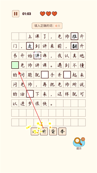 3、选剩余汉字填入空缺,完成所有填空,推进关卡进度。