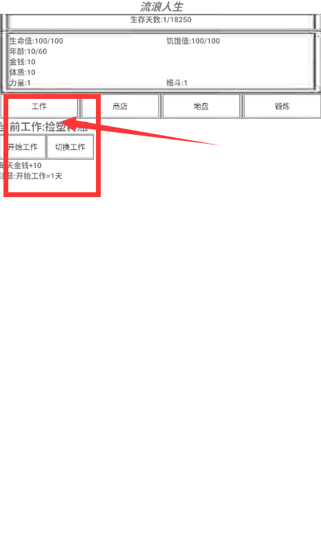 2、游戏中有多种工作可以选择,从捡垃圾到扫马路等。不同工作有不同收入和体力消耗。清洁工稳定但收入低,而高风险工作如黑市交易利润高但可能遭遇事件。