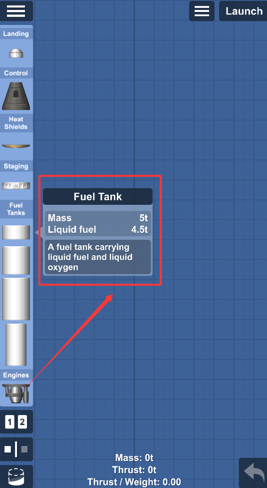 4、进入建造界面后,你会看到很多部件,比如燃料箱、引擎、隔热罩等。屏幕下方会显示火箭的质量、推力等重要数据。