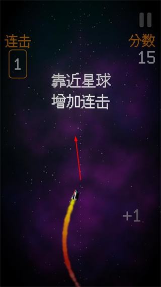 2、操控飞船靠近星球,增加连击数,同时留意界面显示的连击和分数变化,持续推进游戏进程。