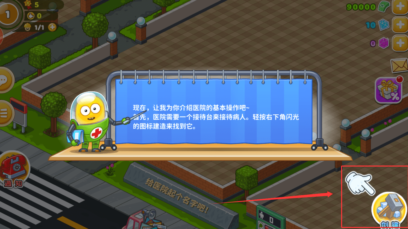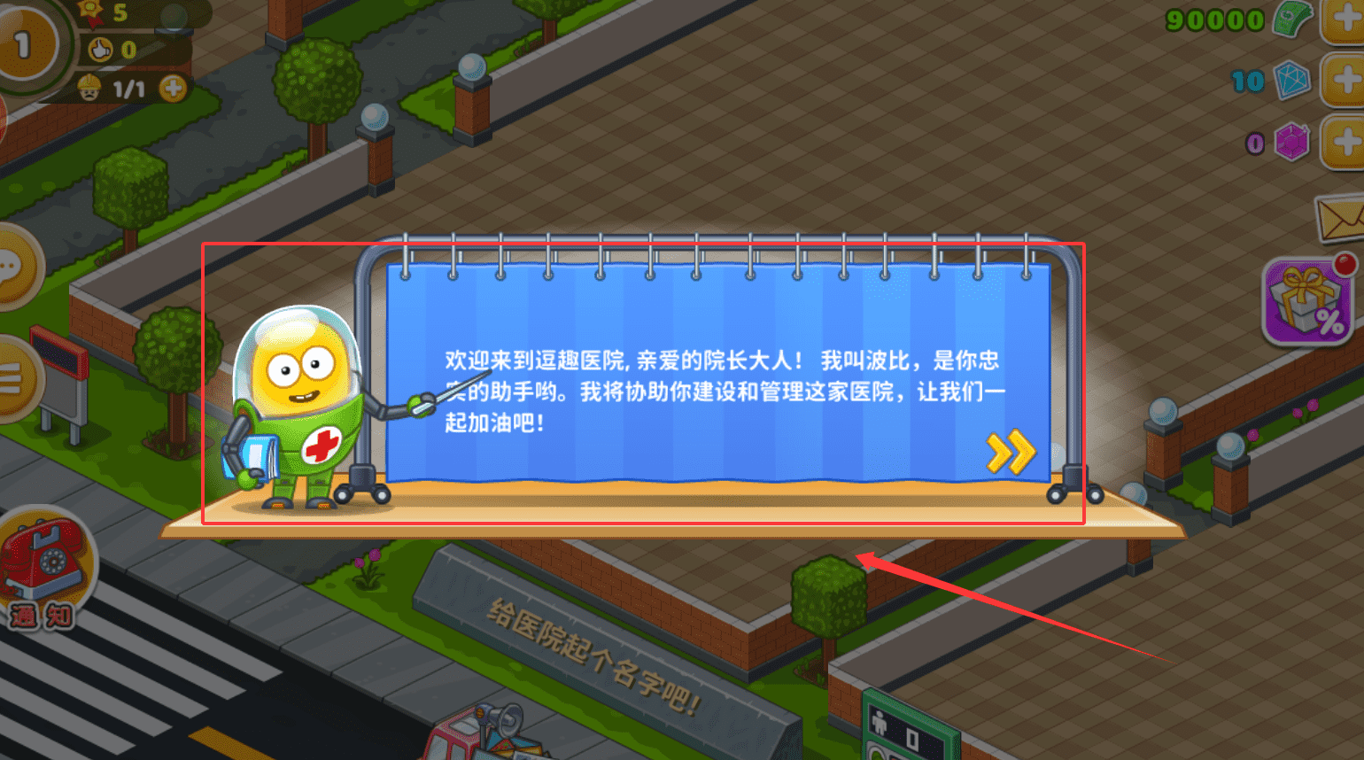1、初次进入逗趣医院时,你会遇到助手波比,她会引导你开始经营医院。