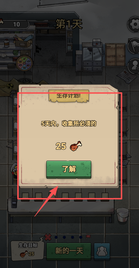 2、游戏开始就是第1天,界面会显示“生存计划”,提醒你在5天内必须收集到所需的生存目标数量。