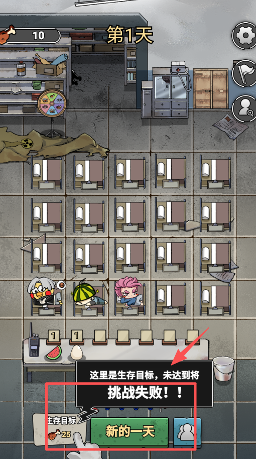 3、每天你都要留意左上角的“生存目标”,如果当天结束时没有达成目标数量,挑战就会直接失败。