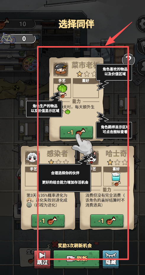 4、游戏过程中可以“选择同伴”,比如菜市老板、感染者或哈士奇,每个角色都有不同能力和喜好。