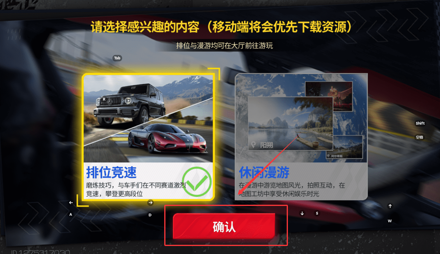 2、接着会进入内容选择界面,这里需要从排位竞速和休闲漫游中勾选你喜欢的模式,移动端会优先下载所选资源,最后点击确认就好。