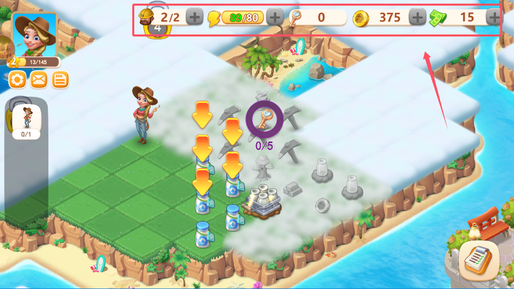 1、刚开始玩要留意界面顶部的资源显示,包括金币、绿钞、任务进度等数据,这些资源是你扩建农场、购买种子、升级设施的必要条件,合理分配使用能提高发展效率。