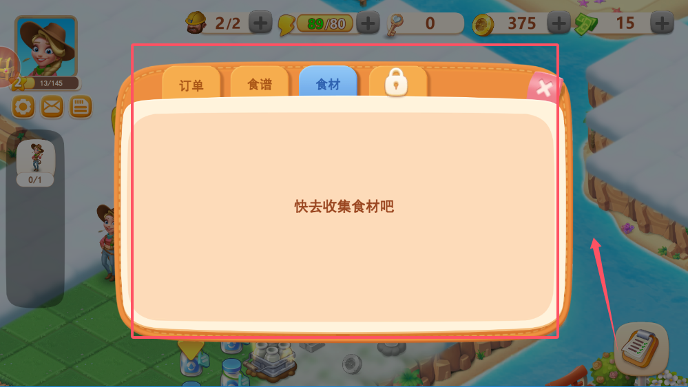 4、食材收集需要你主动操作,点击食材按钮会有收集提示,在农场不同区域能找到各类作物和原料,记得定期采集保持库存充足,这样制作菜品时才不会缺少必要材料。