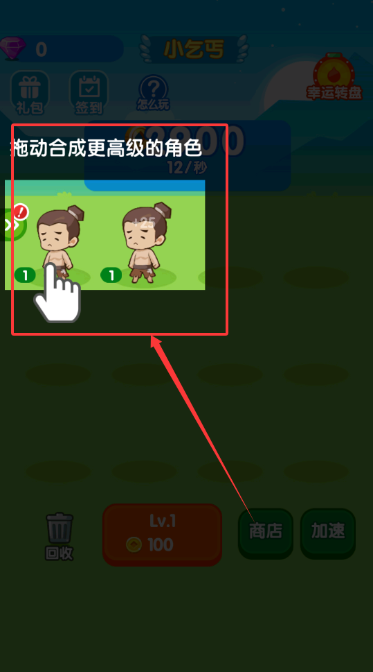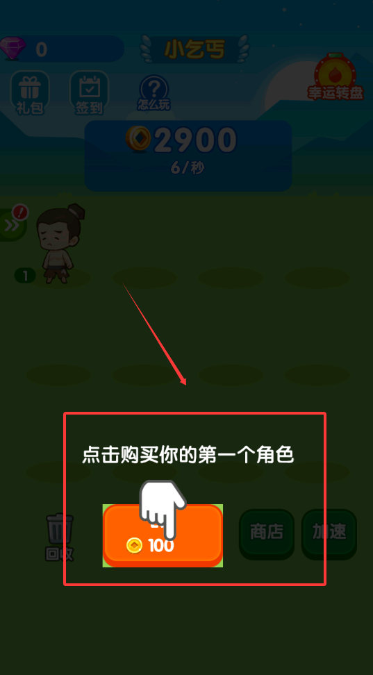 1、游戏一开始你要先点击购买第一个角色,比如从小乞丐或者包身工开始,界面下方有商店和加速按钮,可以帮你起步呢。