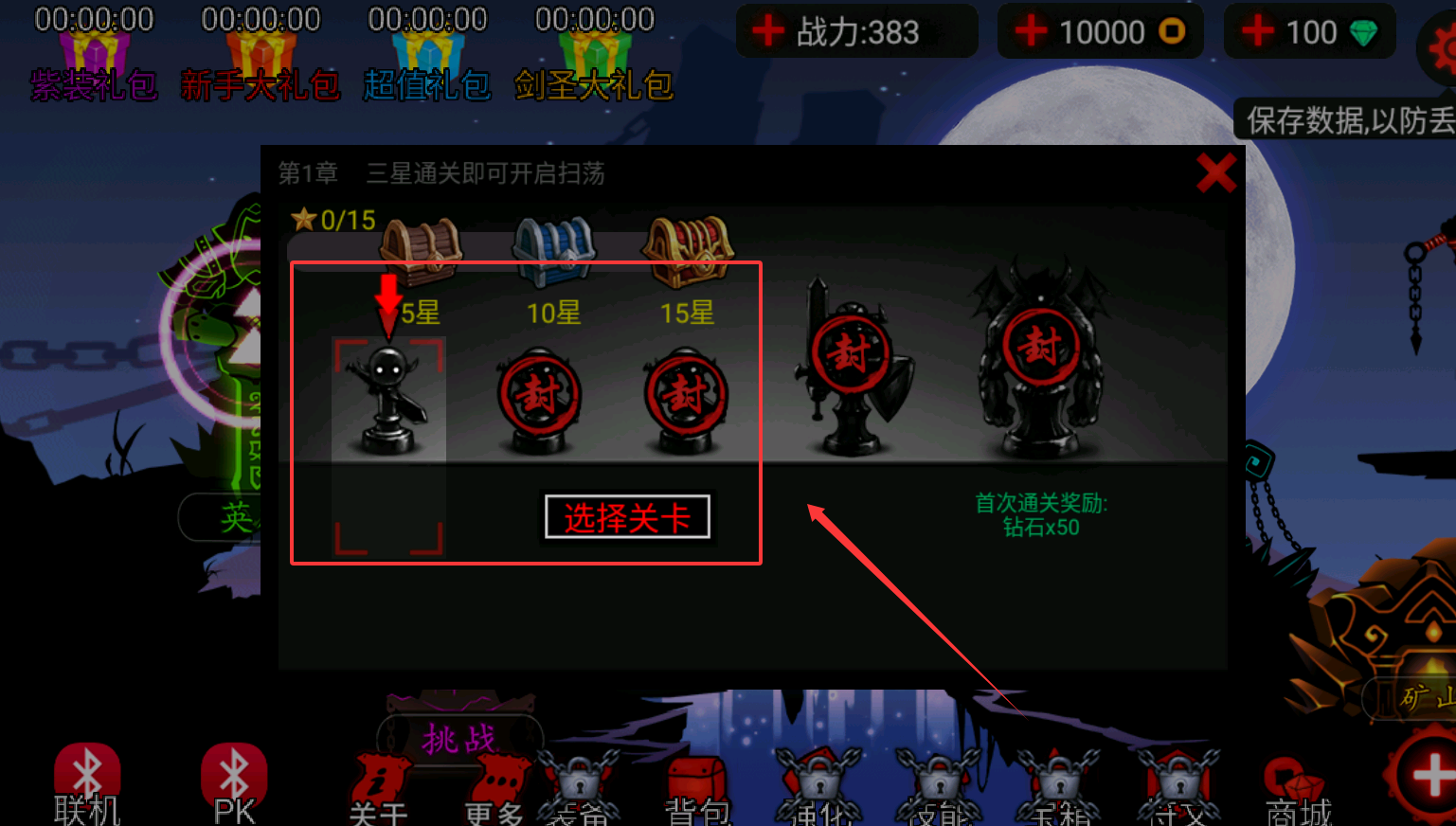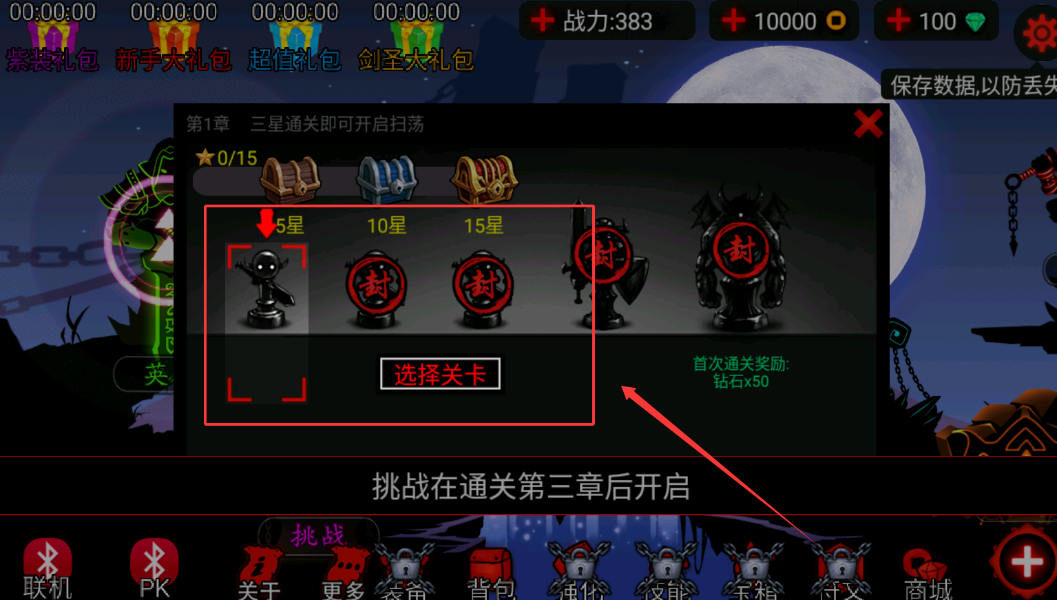 2、进入章节界面后,核心目标是推进主线。例如第1章,你需要收集星星来解锁扫荡功能,每关最多三星。
