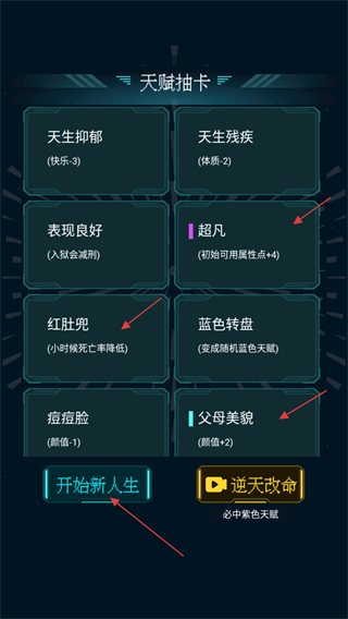 2、在天赋抽卡界面,可自行选择三个天赋,点击开始新人生进入属性调整。