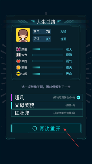 4、人生总结后,选择继承天赋,点击再次重开开启下一轮人生模拟,积累更强天赋。