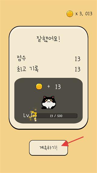 3、结算界面点击继续游戏,积累分数提升小猫等级,获取金币奖励。