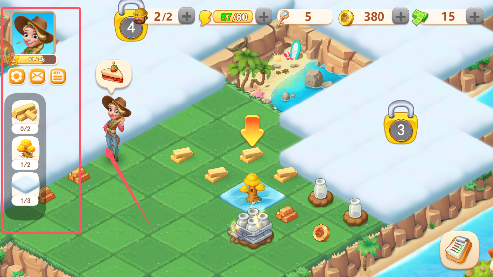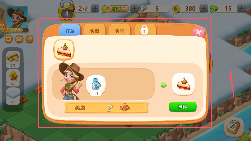 2、牛仔角色发布的订单是你早期获取资源的重要途径。点击“订单”查看具体任务,比如制作蛋糕需要5个罐子。完成任务不仅能获得金币奖励,还能积累经验快速升级。