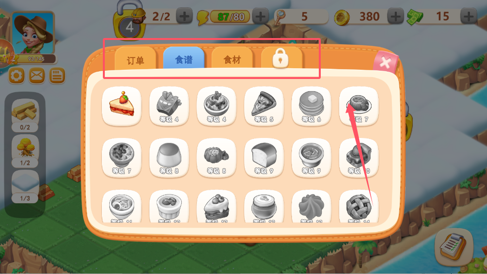3、在“食谱”界面学习食物制作方法,从简单的农产品加工到复杂的糕点制作。制作食物需要消耗相应食材,这些食材可以通过农场种植或完成任务获得。