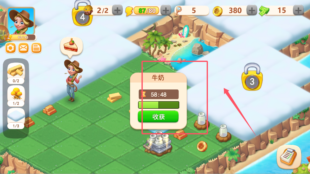 4、生产建筑如牛奶厂需要等待倒计时结束后点击“收获”。如果急需产品,可以使用“移除”功能加速,但会消耗2个资源。被锁的建筑上标有解锁等级,这是游戏进度的指引。