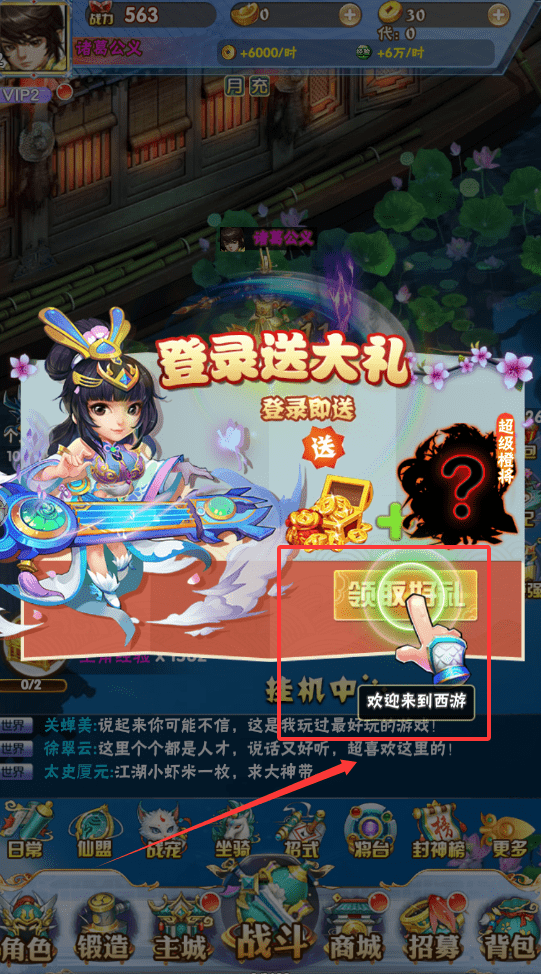 1、首先呢,进入游戏后别急着乱点,你可以先留意下首页左下角的“登录送大礼”活动,记得每天领取免费奖励。
