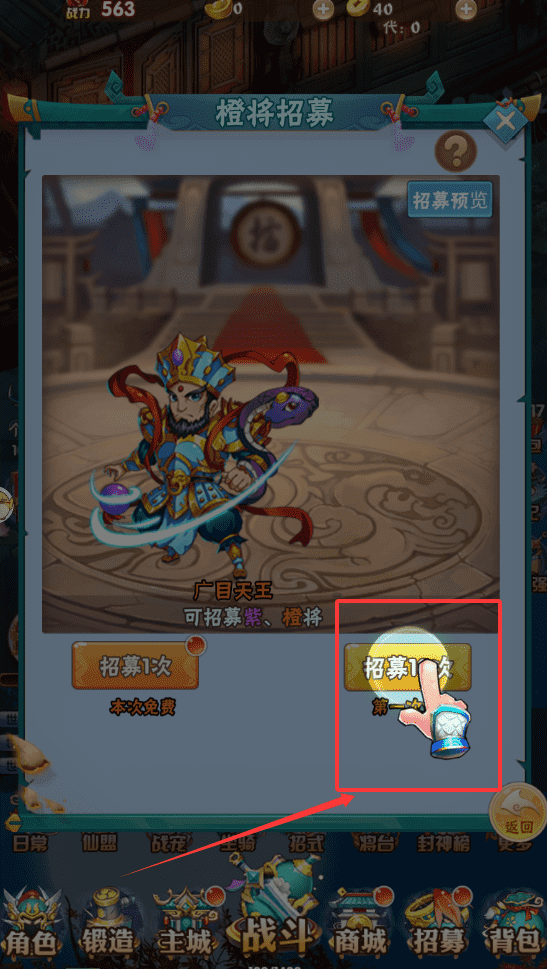 2、关于核心的“招募”系统,你可以在首页找到“橙将招募”的入口。这里能抽到紫色和橙色品质的武将,比如广目天王。