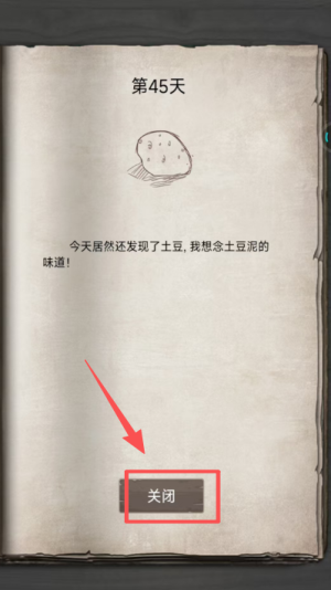 2、游戏过程中会弹出日记记录界面,查看当日内容后,点击下方的关闭按钮回到主场景。