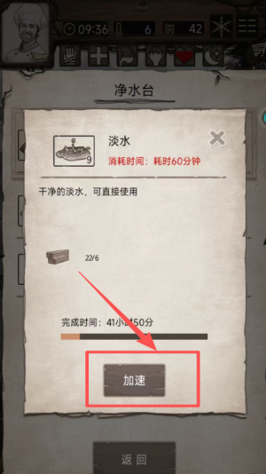 3、进入净水台界面,可查看淡水的消耗时间,点击加速按钮能缩短淡水的制作时长。