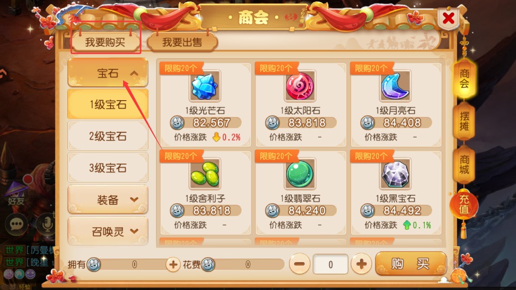 3、使用商会买卖物品很方便,点击游戏界面上的“商会”按钮,如果想买东西就选“我要购买”,在分类中找到想要的物品,查看价格后点击购买,想卖东西就选“我要出售”上架物品。