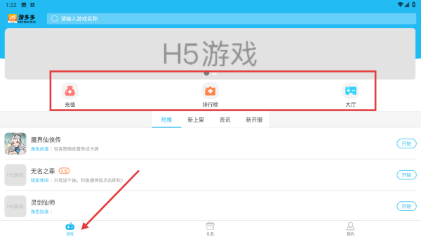 1、打开APP,点击底部游戏选项,进入页面。