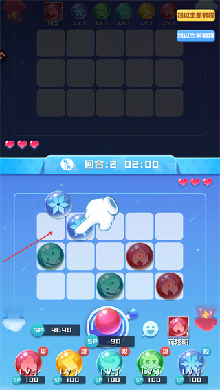 2、将同类型球球放在相邻格子,方便合成升级提升属性;合成优先选择攻击类球球,快速强化输出能力,像教程中相邻放置雪花球球触发合成。