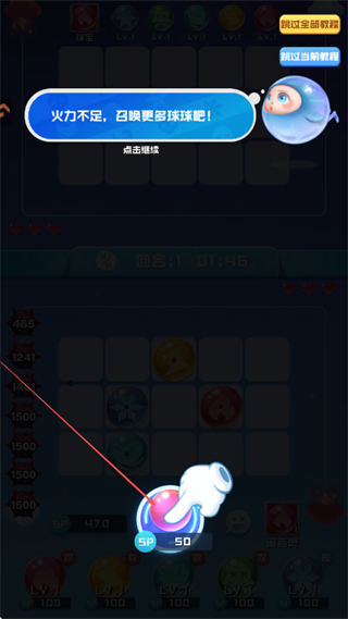 3、当火力不足时,消耗SP能量召唤更多球球,增强战斗阵容,应对更强的敌人。