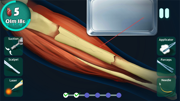 采用虚拟按键与拖拽操作模式,器械选择、切口控制等操作逻辑清晰,搭配详细新手引导,即便无医学知识基础,也能快速掌握核心手术技巧。