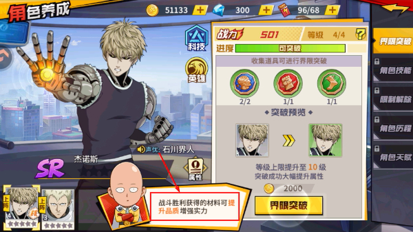 4、在【角色养成】界面用战斗材料提升【杰诺斯】品阶,进一步增强战力,助力后续关卡挑战。