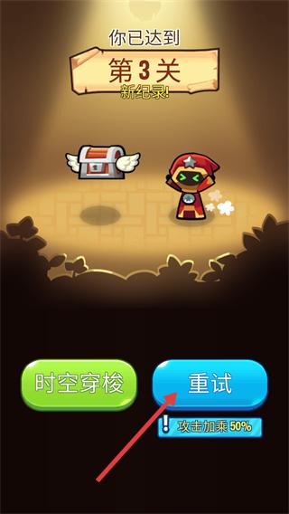 4、完成【关卡3】获得新纪录,点击【重试】按钮可再次挑战该关卡,同时享受【攻击加50%】增益。