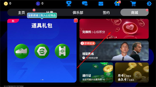 1、在实况足球首页,点击顶部导航栏的商城选项,进入商城页面。