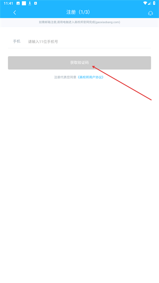 3、在注册页面的指定输入框中填写11位有效手机号,点击获取验证码按钮。
