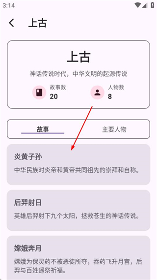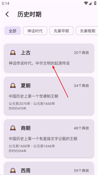 2、在历史时期页面,点击上古分类,可进入上古时期的典故列表页面。