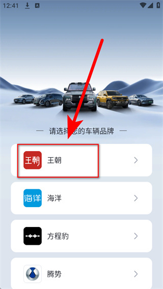 1、打开比亚迪云服务,在车辆品牌选择页面,点击车辆品牌,进入王朝品牌对应的车型页面。