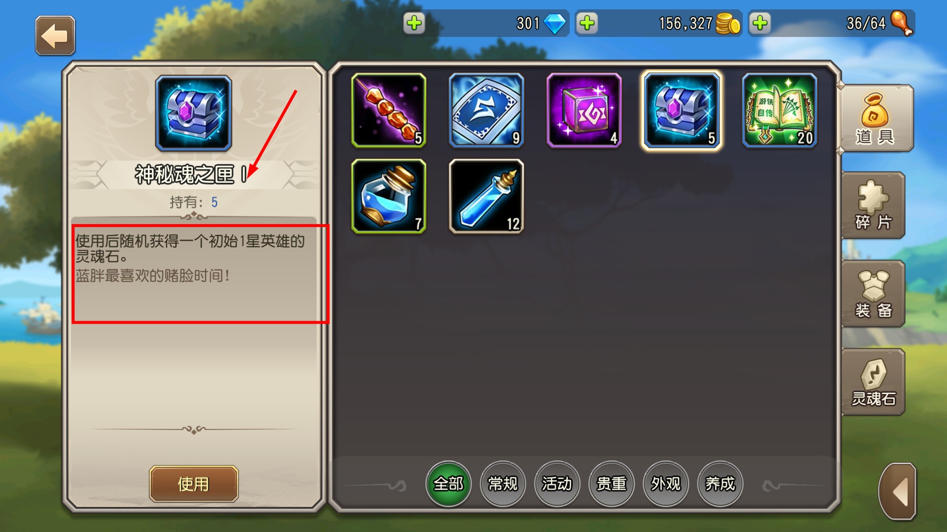 1、使用【神秘魂之匣】可随机获得初始1星英雄的灵魂石,持有5个时点击使用来获取英雄灵魂石。