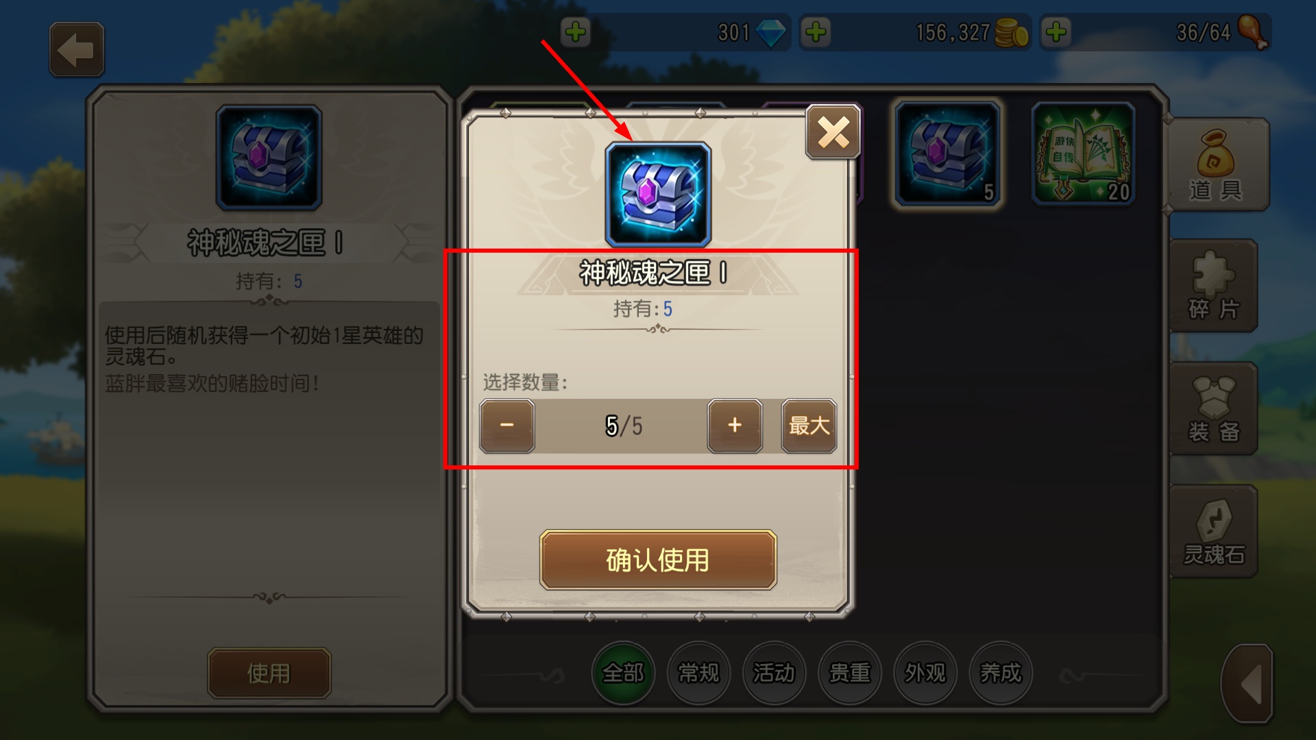 2、使用【神秘魂之匣】时调整选择数量,当前持有5个选择5个后点击确认使用开启宝箱。