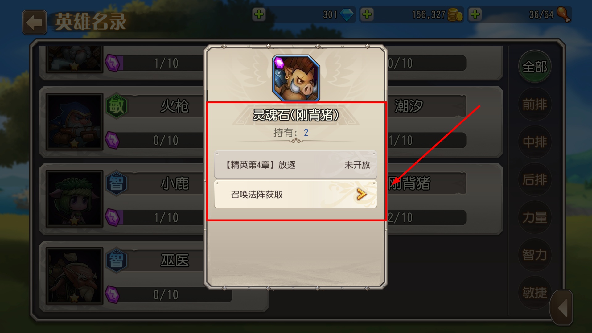 4、在英雄名录查看【灵魂石(刚背猪)】持有数量及获取途径,当前可通过召唤法阵获取。