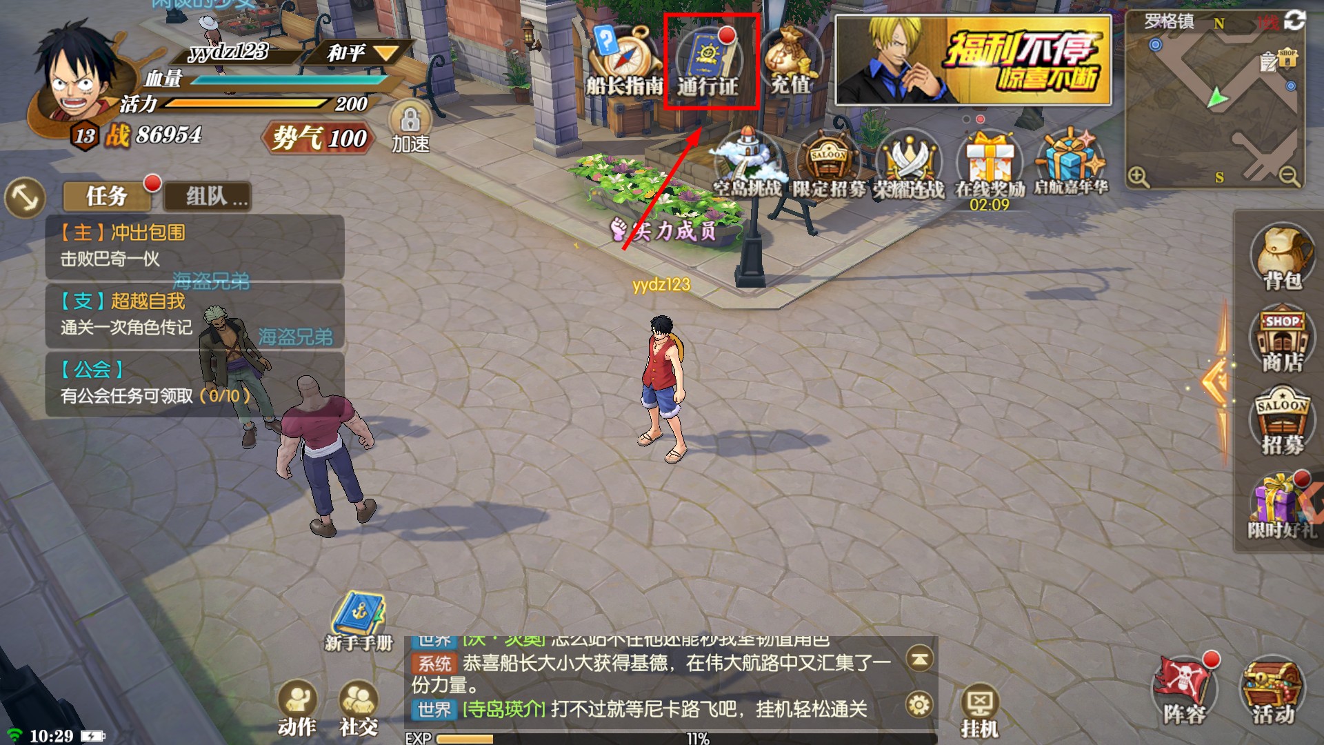 1、点击界面中的【通行证】按钮,进入对应的功能界面,开启通行证相关的任务与奖励获取流程。
